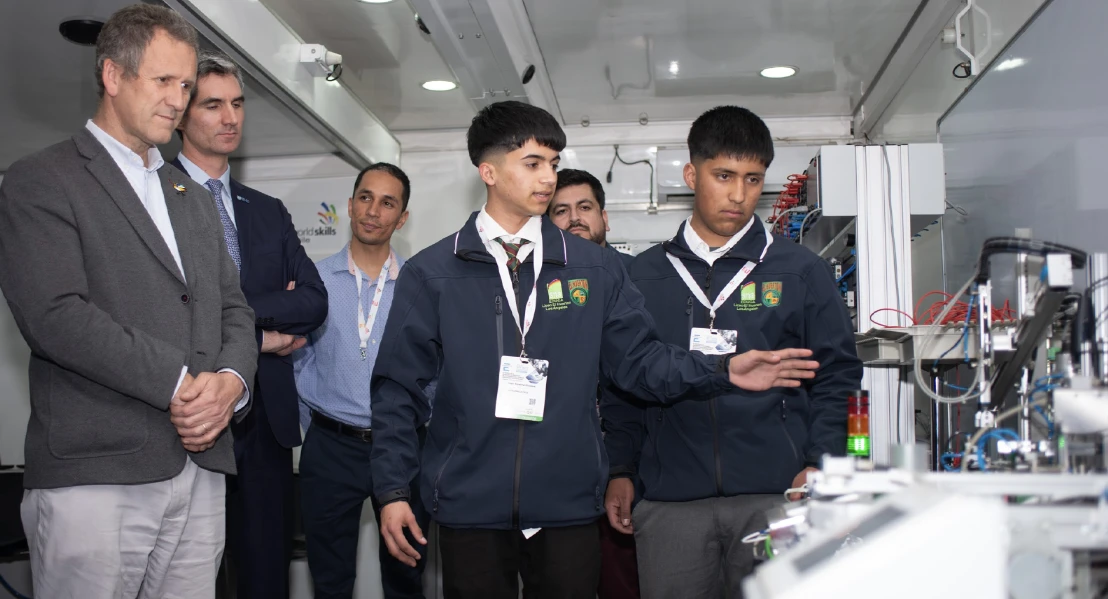 Luego de la ceremonia oficial, el ministro Muñoz visitó el stand de WorldSkills Chile, donde se estuvo el Aula Móvil de la Red SNA Educa, quien fue recibido por el director corporativo de WorldSkills Chile, Jorge Arismendi, el gerente comercial de SMC, Miguel Dávalos, el gerente de innovación y nuevos negocios de Emasa, Arsenio Fernández y el representante del Ministerio de Educación Pablo Fernández. En el lugar, el secretario de Estado presenció la demostración de los estudiantes de tercero medio del Liceo Agrícola El Huertón de Los Ángeles, César Riquelme y Maximiliano Pulgar, quienes a bordo del Aula Móvil – un camión adaptado como laboratorio para la enseñanza y práctica de la mecatrónica y robótica – realizaron exhibiciones de la habilidad.